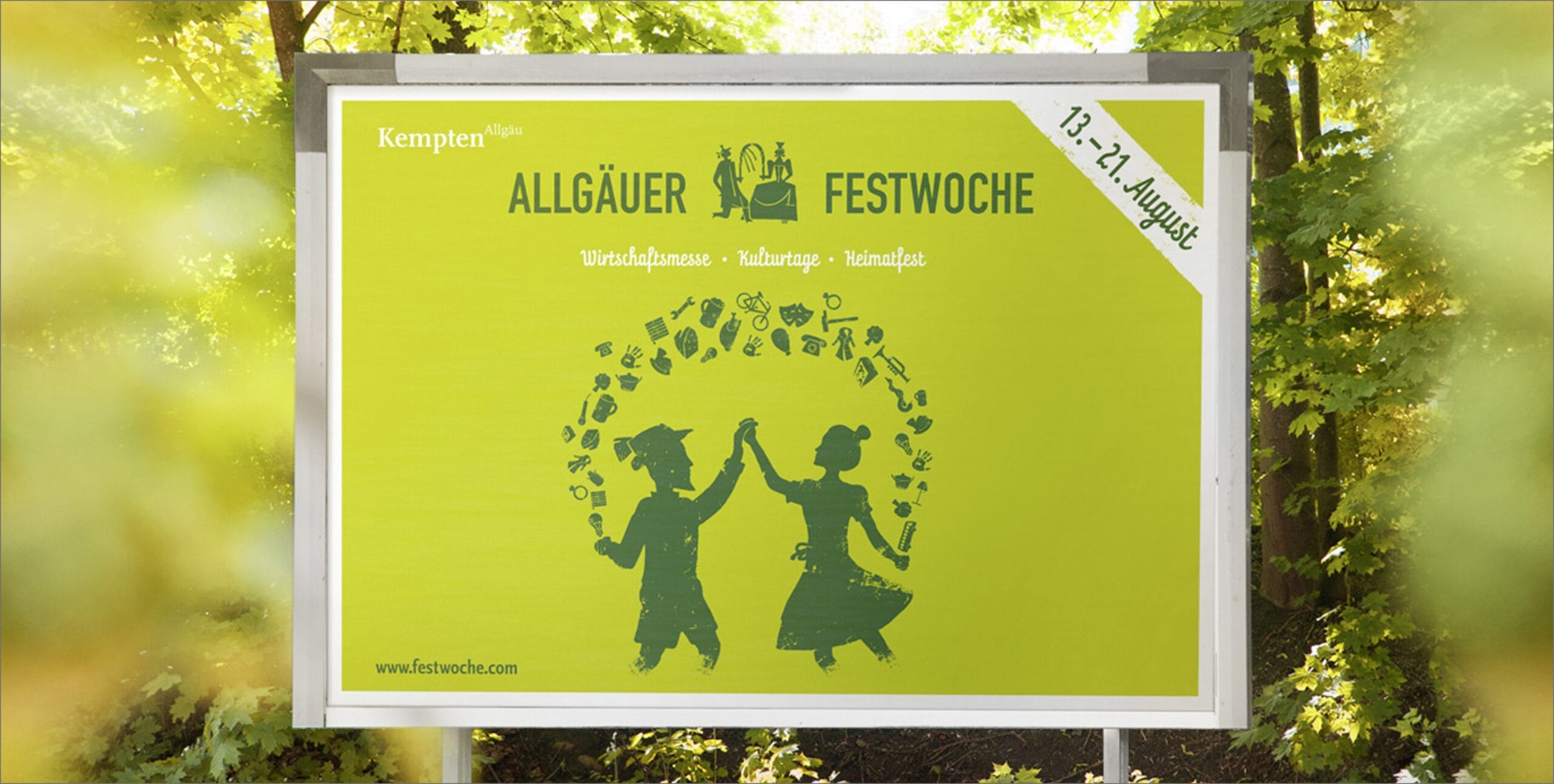 Die Allgäuer Festwoche ist das Sommer-Highlight im Allgäu und zieht jährlich hunderttausend Besucher nach Kempten: Für das 10-tägige Riesenevent haben wir die Markengrundlagen, die Positionierung und die Markengestaltung entwickelt. Der Markenkern „Heimat & Vielfalt“ zieht sich durch das gesamte CD: Angefangen bei Plakaten und Anzeigen über Flyer, Leitsysteme und Übersichtspläne bis hin zum Bierdeckel. Schee war’s. Prost und Mahlzeit!